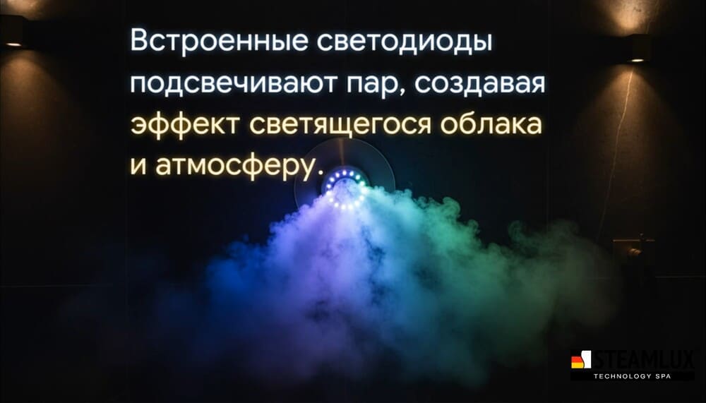 Эстетика пространства. Современные форсунки с подсветкой создают визуальные эффекты: от мягкого свечения до динамичной смены цветов, которая превращает парную в SPA-пространство премиум-класса.