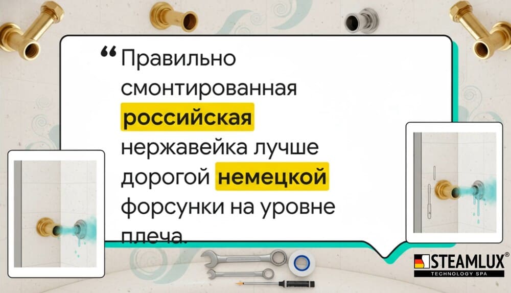 ✅ Материал и установка важнее бренда. Российская нержавейка, правильно смонтированная внизу стены, лучше дорогой немецкой форсунки, торчащей на уровне плеча.