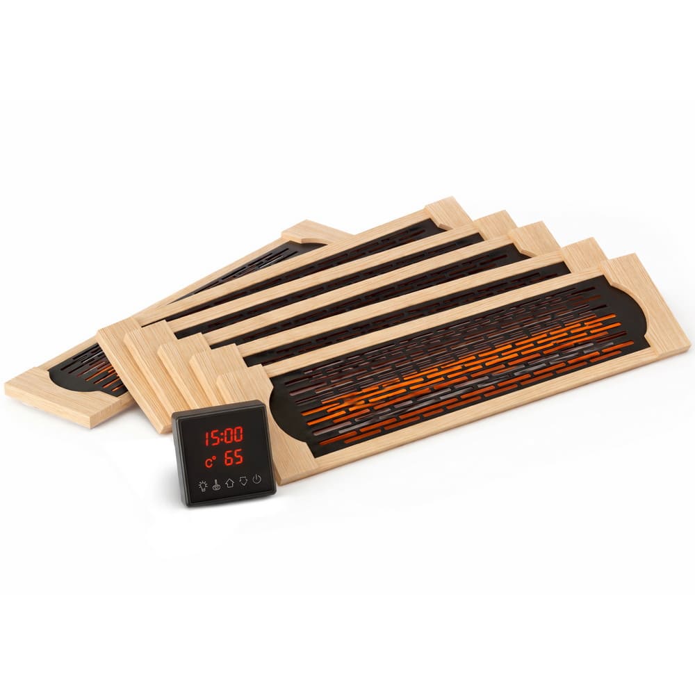 Комплект современных инфракрасных излучателей, обеспечивающий эффективный и равномерный прогрев сауны. Контроль температуры и времени работы осуществляется дистанционно с помощью LED пульта, что позволяет точно настраивать режим и поддерживать стабильные параметры без выхода из сауны.